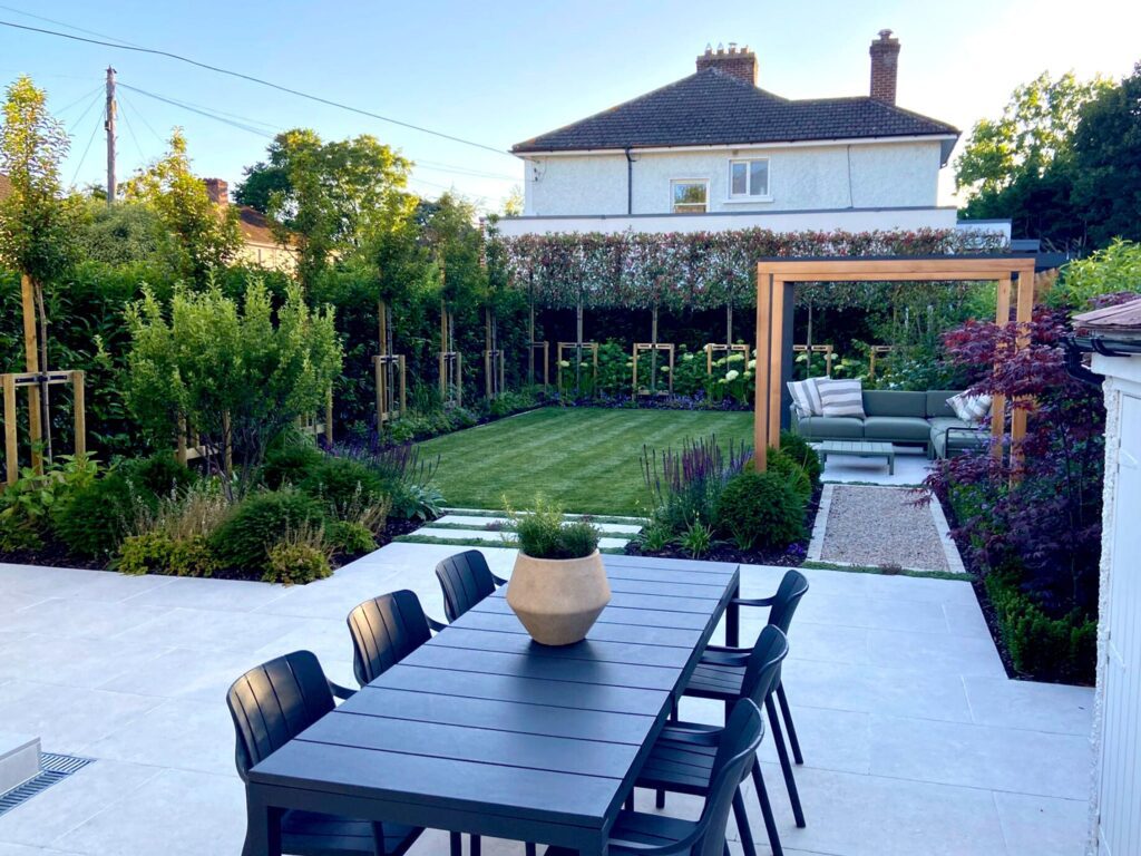 Blank Canvas to Dream Garden: Rathgar Transformation Location: Rathgar, Dublin Features: Two patios, Pergola, Lawn, Seamless Integration blending indoor and outdoor, Mature Plantings, Instant Privacy, Year-Round Appeal. Planting: Multi-stem tree Amelanchier Rainbow Pilar, Taxus Domes, Acer Bloodgood, Corylus, Hydrangea Annabelle, Pleached trees, Standard Trees, Hedging