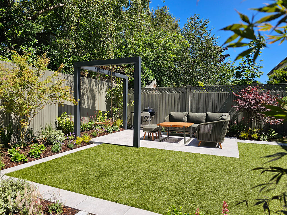 Porcelain paving provides a clean contemporary base, leading to a relaxing lounge area. Pleached trees and evergreen hedging offer privacy, while a mix of trees, tree ferns, and layered planting adds texture, softness, and year-round colour.