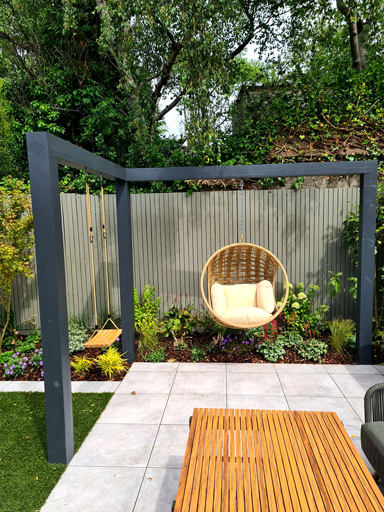 A dedicated play zone includes a bespoke swing and an inviting egg chair, making the garden a space for the whole family to enjoy. With a low maintenance artificial lawn and considered planting, the result is a functional and elegant outdoor space that connects seamlessly with the home.