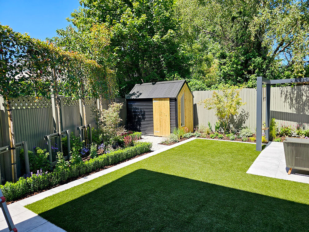 Garden design and build · Porcelain paving · Screening trees and hedging · Tree ferns and planting · Artificial lawn · Bespoke swing and seating area