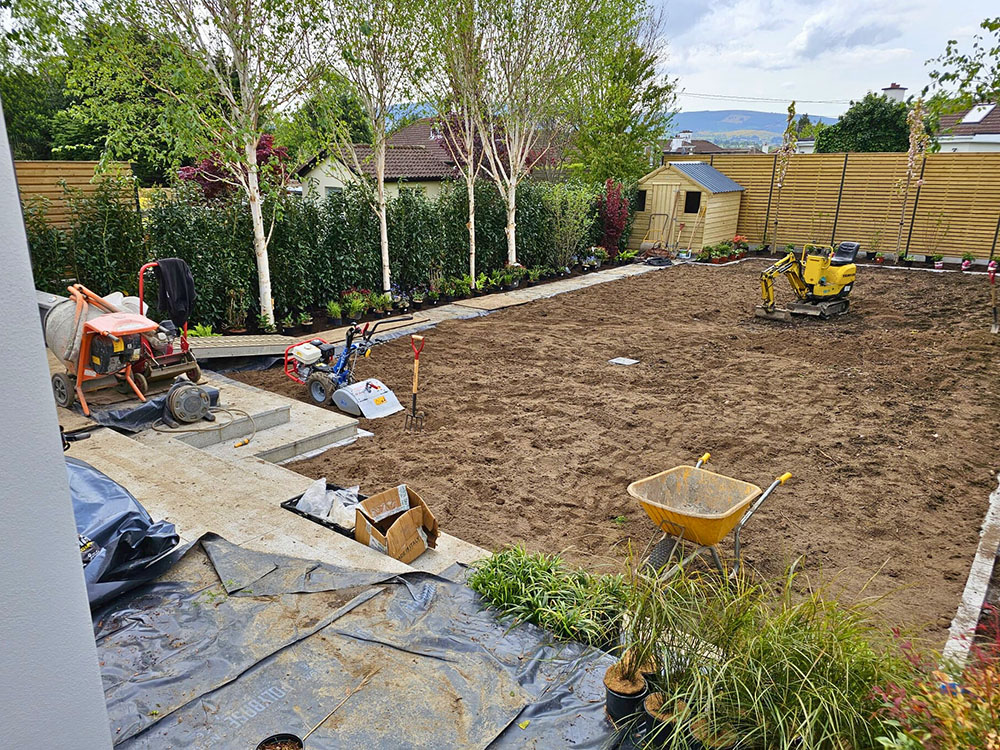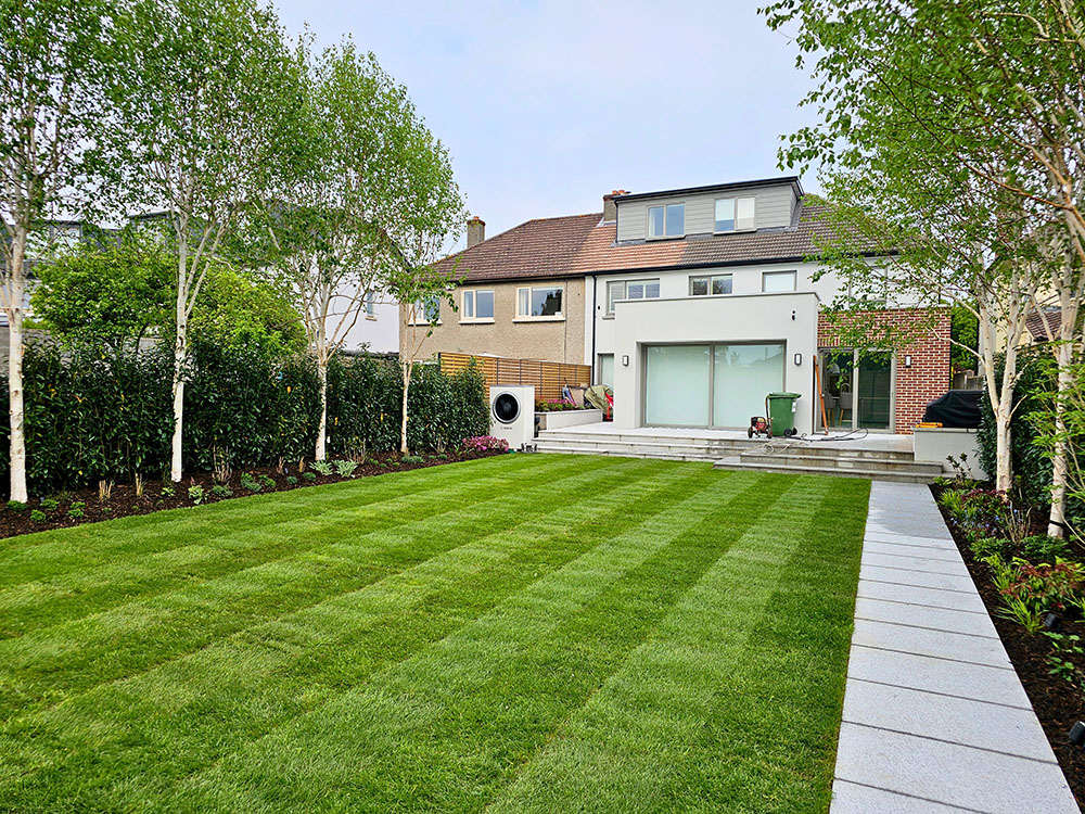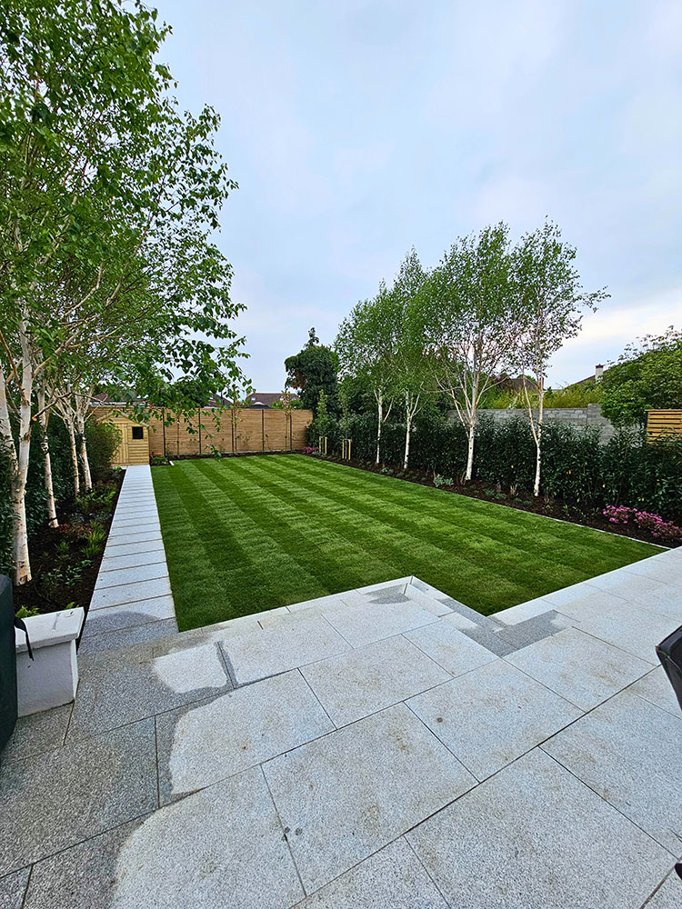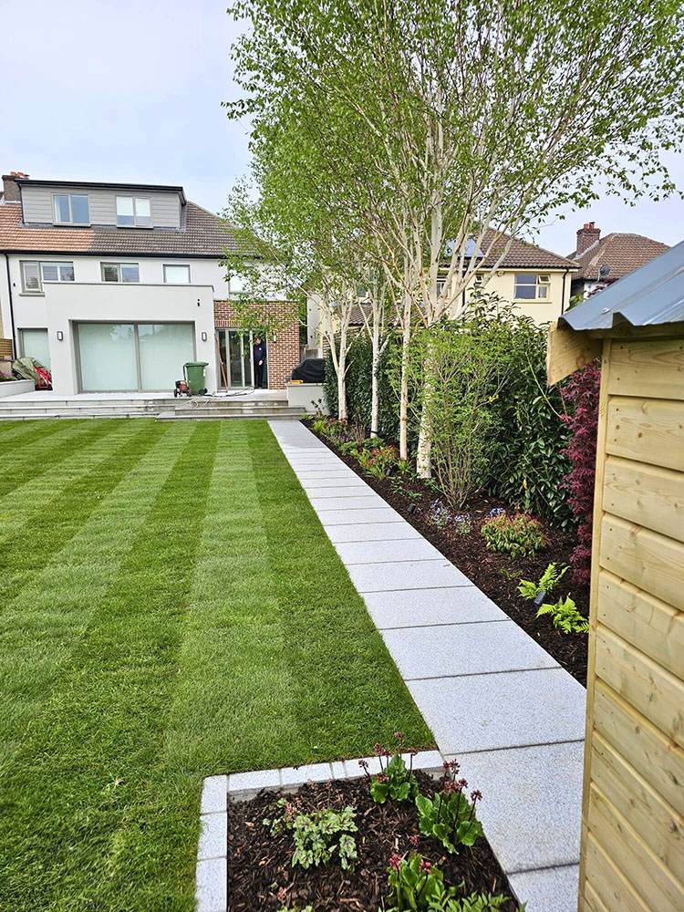 Services Undertaken: Garden design and planting · Silver granite path and edging · Tree and hedge installation · New lawn and planting